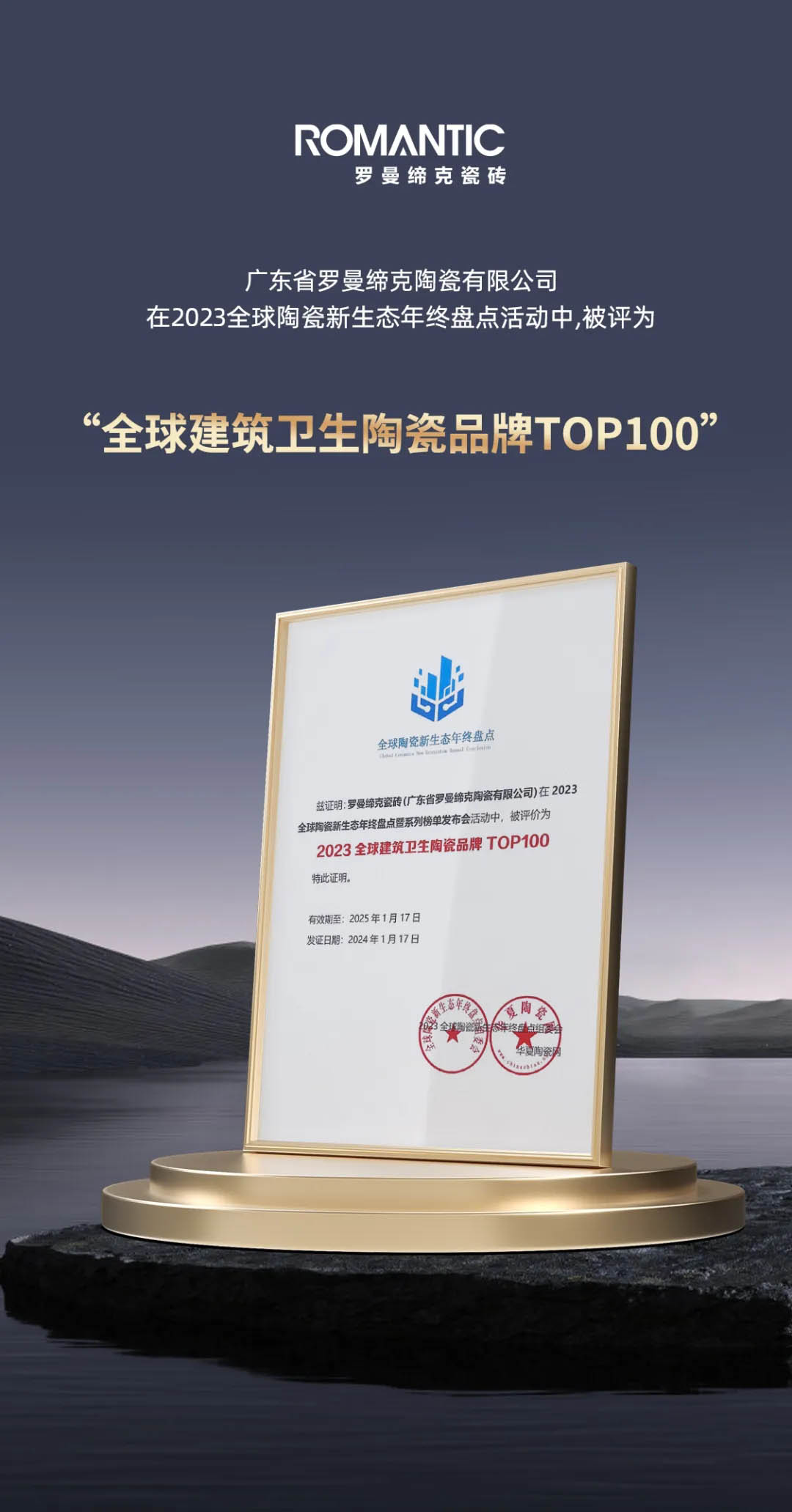 1月17日,增長的秘密——2023全球陶瓷新生態(tài)年終盤點暨設(shè)計驅(qū)動產(chǎn)品供應鏈論壇在中國陶瓷總部劇場隆重召開?,F(xiàn)場舉行系列榜單發(fā)布暨頒獎禮,羅曼締克瓷磚憑借卓越的品牌實力、創(chuàng)新的產(chǎn)品與技術(shù),榮獲“2023全球建筑衛(wèi)生陶瓷品牌TOP100”及“2023年度高增長品牌”雙項榮譽。